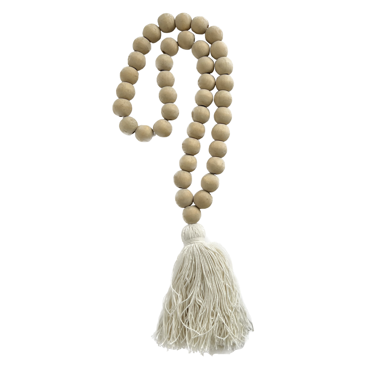 Handmade wooden beads with a cream coloured tassle, made by the local villagers in Indonesia.