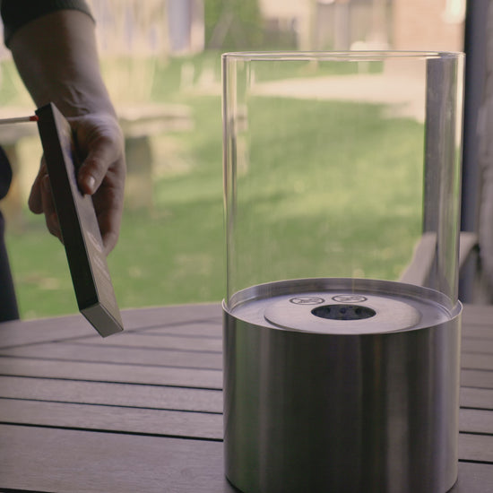 With surrounding safety glass it provides maximum visibility of the flames. It has a burn time of up to 2.5 hours per filling and requires no electricity.
