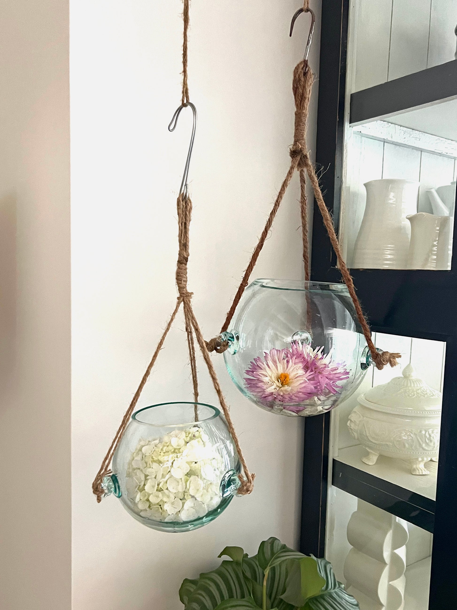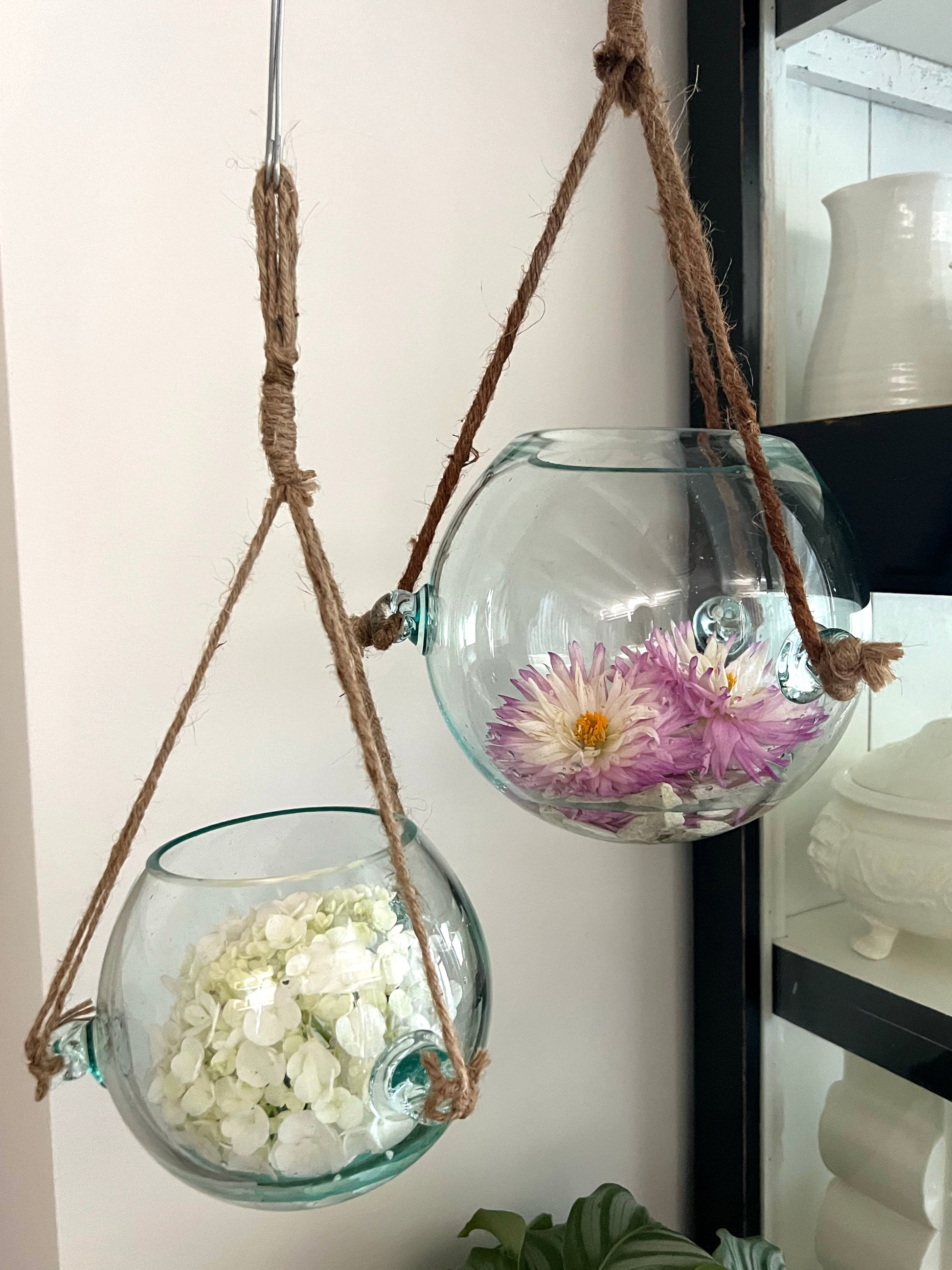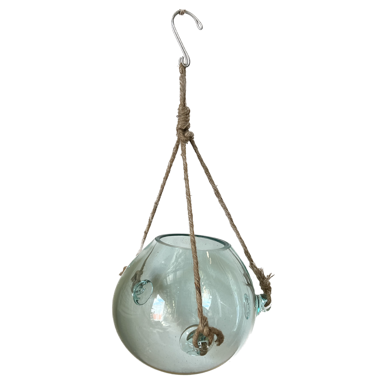 Featuring uniquely crafted glass, this hanging art glass is a distinctive addition to any home or garden. Each piece is individual and not one is the exact same. An elegant blend of form and function, this piece adds a unique flair to any décor. Leave empty or plant your own, the choices is yours.