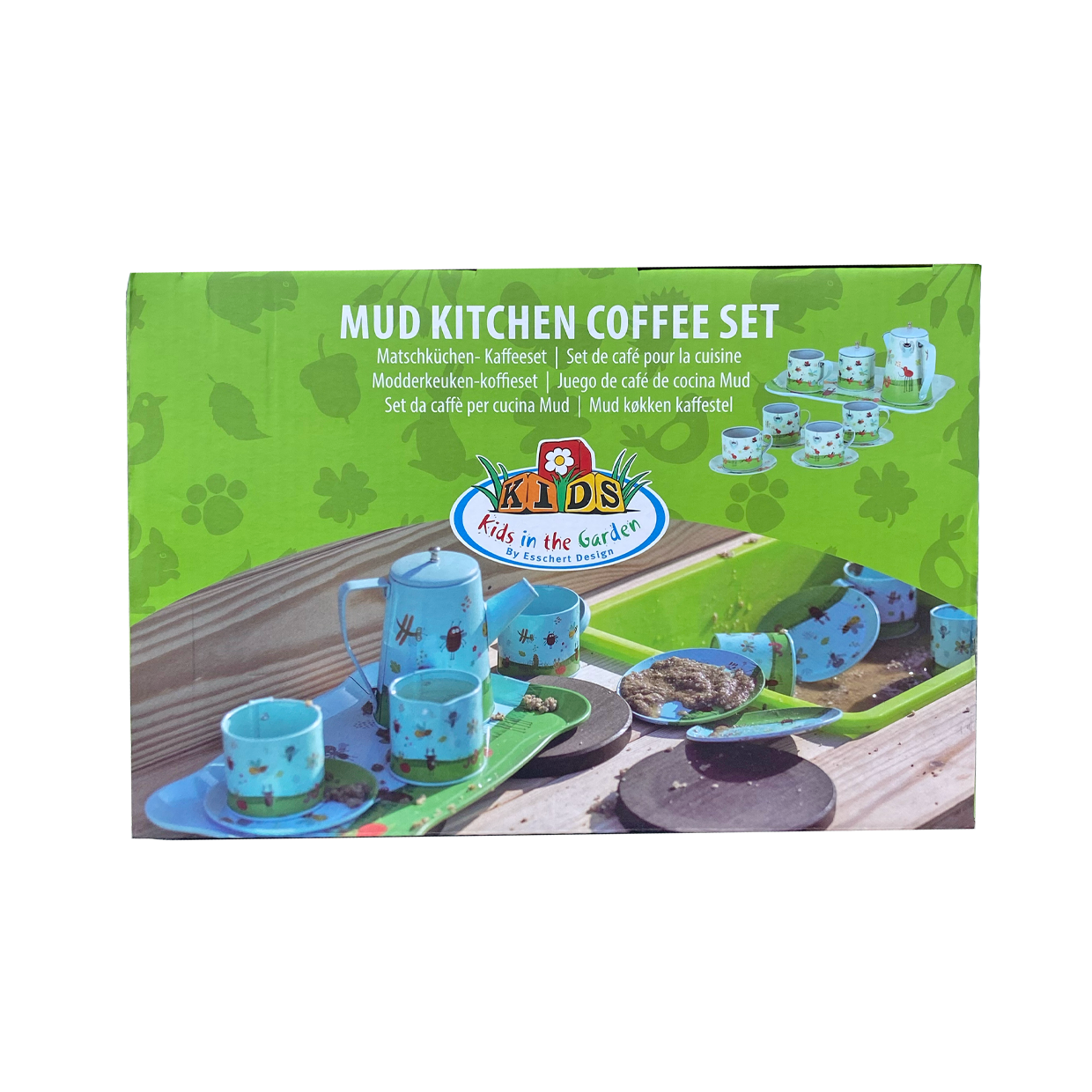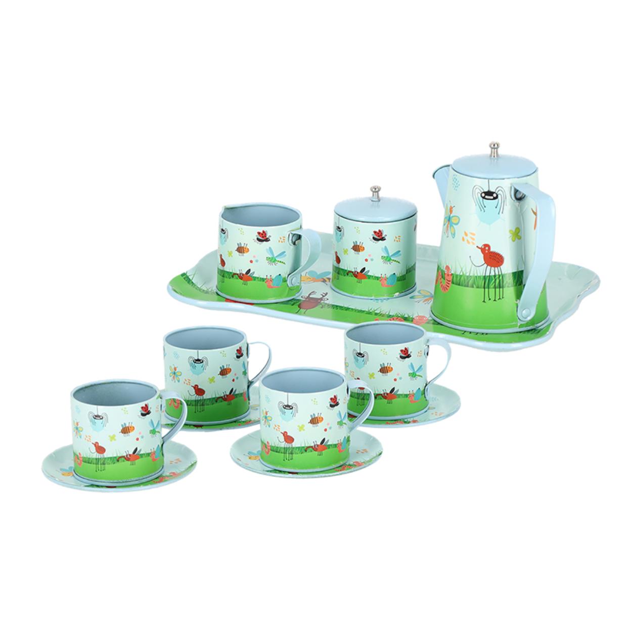 Beautiful metal kids tea or coffee set in an intricate insect print. Comes with everything you need for hours of fun serving tea or coffee. Also great as a water play station for kids. 12 piece set.