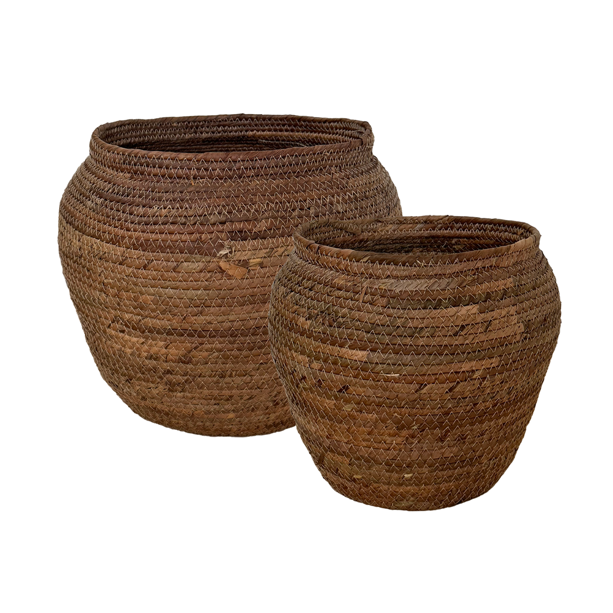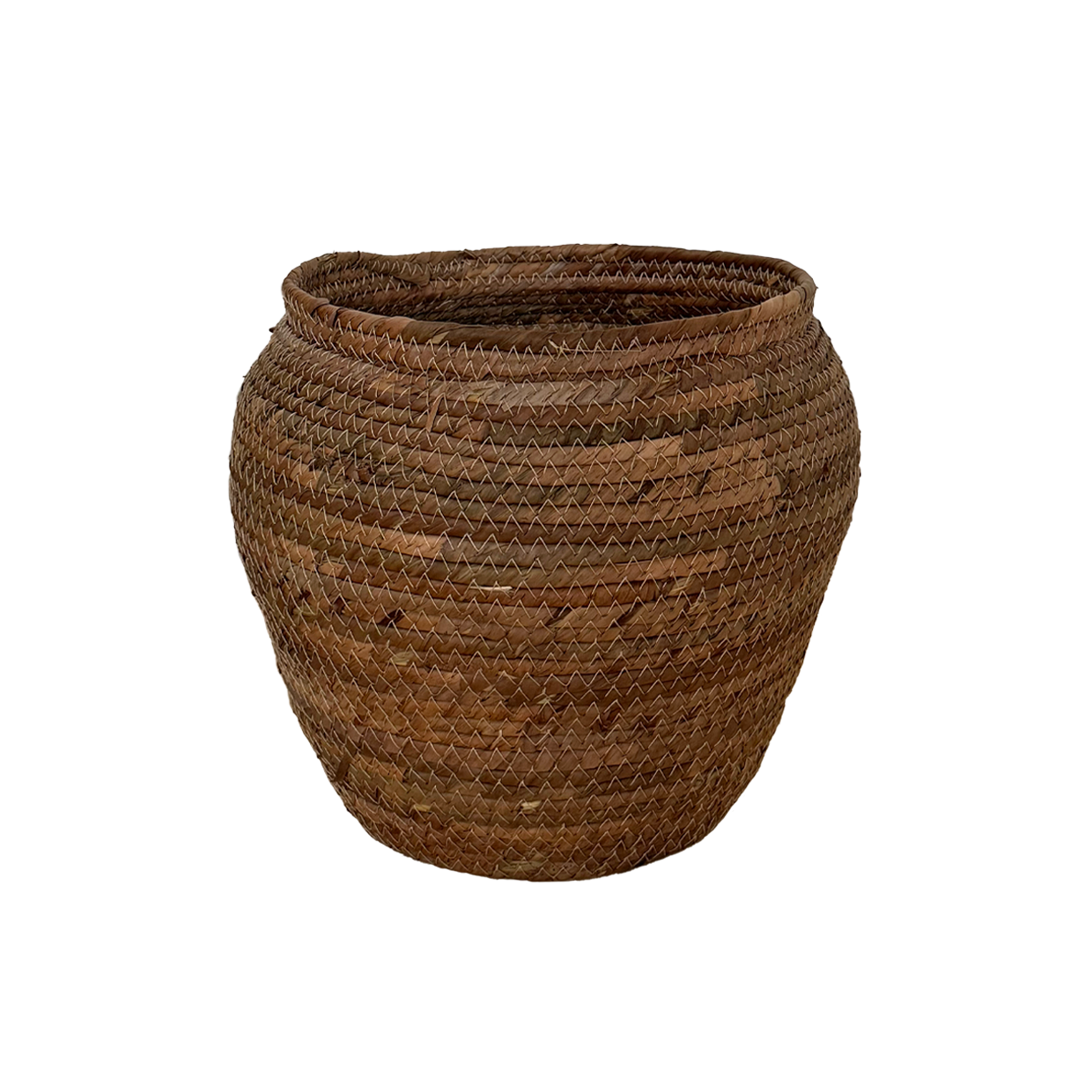 Woven by hand from natural banana leaf, each basket showcases beautiful organic shapes, designed for use in every room of the home. Available in a variety of sizes and silhouettes, they are perfect for holding household essentials—knitting, magazines, children’s toys, crafts, or even as stylish covers for potted plants. This one is a classic vase shape.