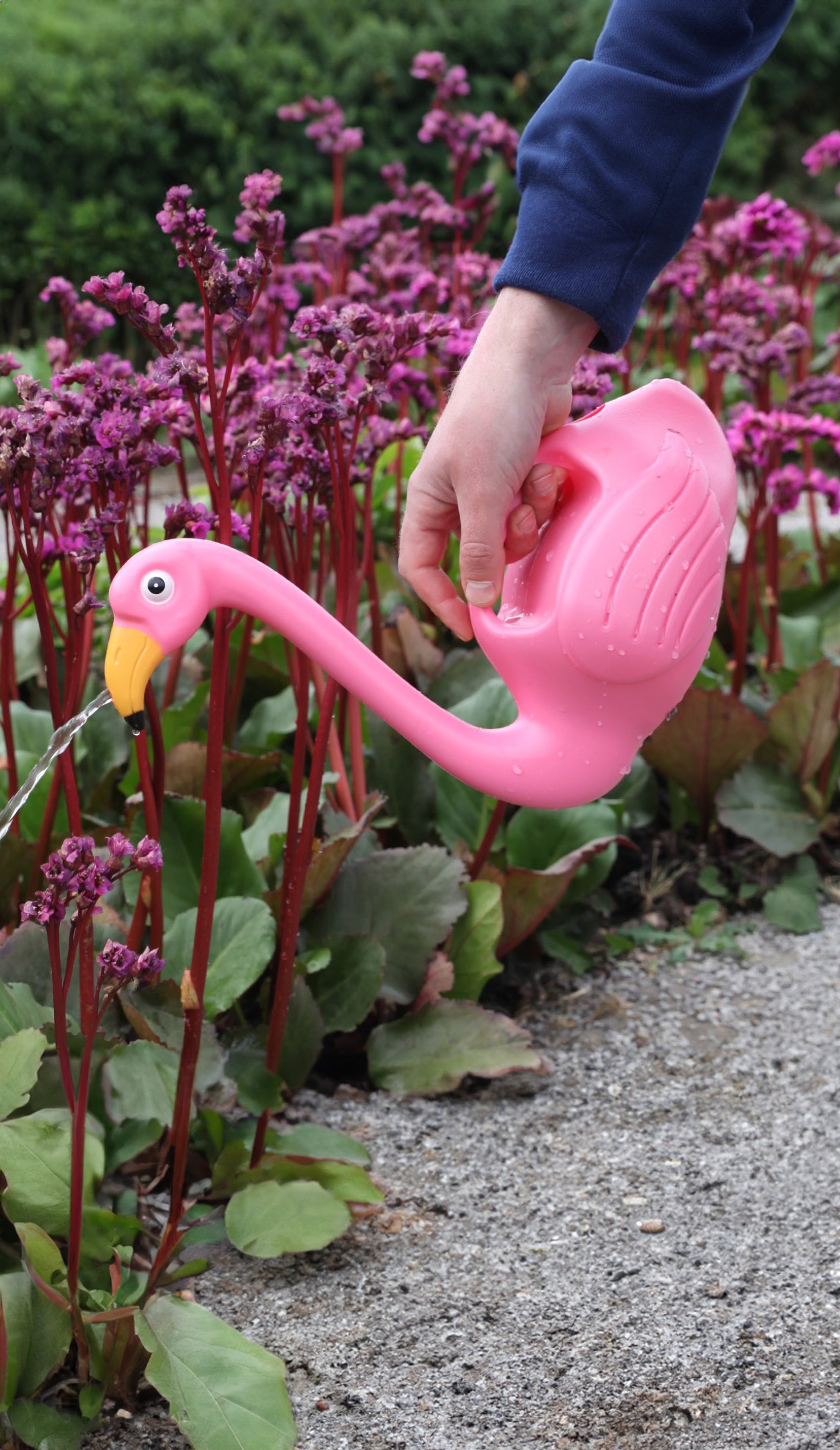 This trendy watering can in the shape of a flamingo is a fun way to water the garden.
