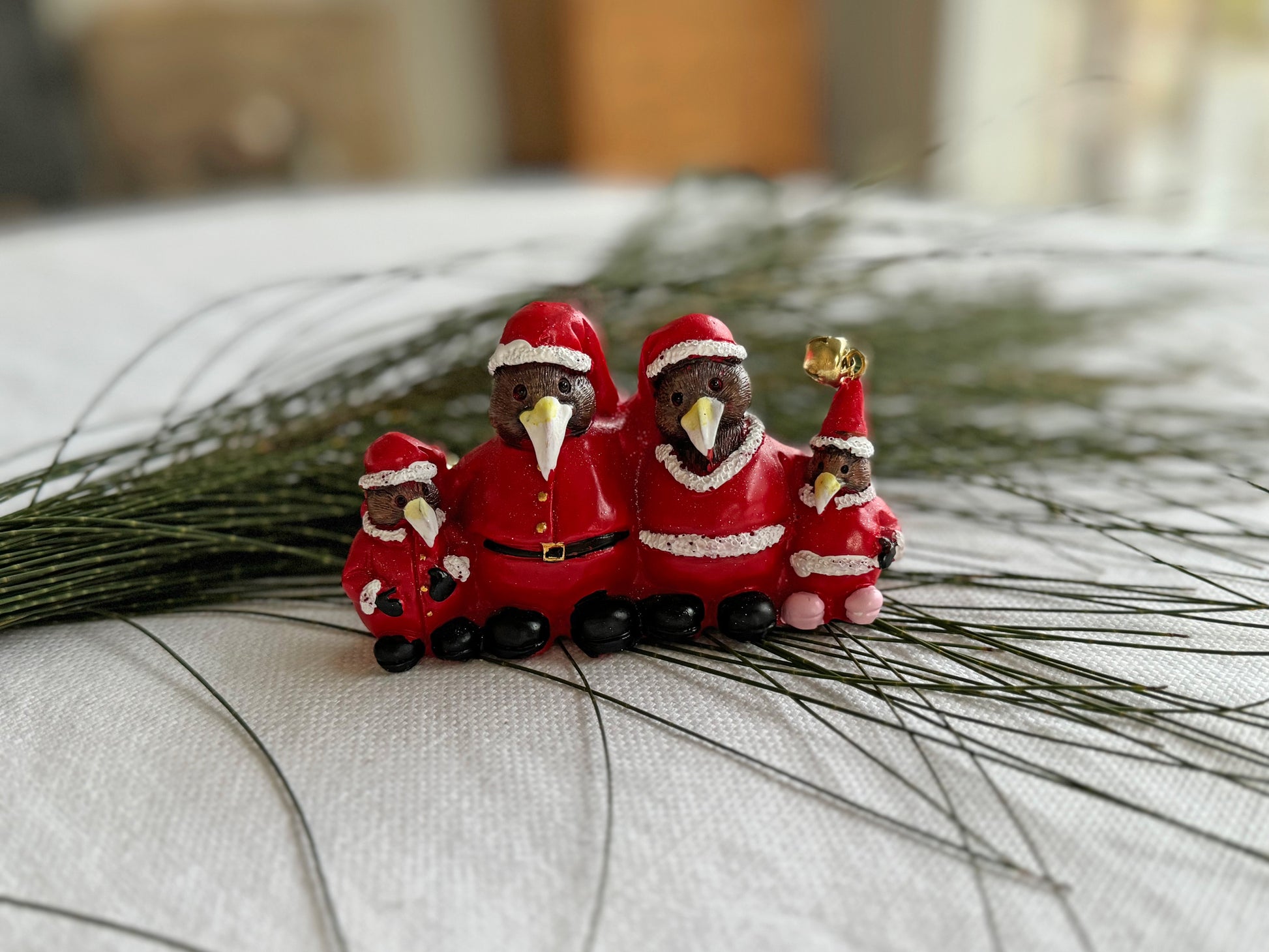 A Kiwi Christmas family sitting decoration to place on a windowsill, dresser or counter. The Kiwi Christmas family are all in their Santa suits and the young sister is rocking her pink boots.
